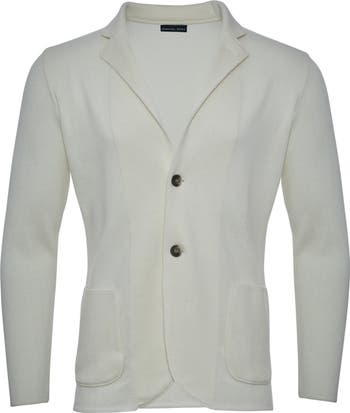 A soft, breathable knit made of merino wool enhances the relaxed comfort of a sport coat that's crafted with minimal detailing and styled to elevate any casual look.