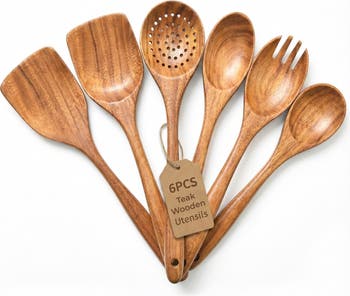 - Premium Natural Teak Wood: Made from premium natural teak wood known for its durability and natural water resistance. This 6-piece set includes a salad spoon, salad fork, serving spoon, skimmer, spatula, and turner for everyday cooking needs.