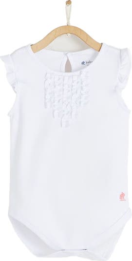 A Must-Have Classic, This Unicolor Bodysuit Is Sleeveless With Shoulder Frills And A Ruffled Chest Detail. It Has A Back Neck Button And Bottom Snaps For Easy Changes. The Contrasting Embroidered Logo Makes It A Wardrobe Staple, Perfect For Any Warm Day.