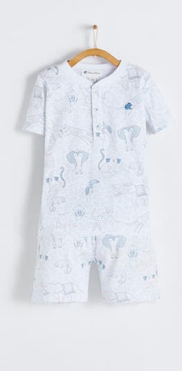 This charming snug fit pajama set includes a short-sleeve top and shorts made from soft Pima cotton. Featuring snap buttons at the neckline up to 24 months, it's easy to dress and undress your child. The print features adorable animals such as elephants, tigers, and chameleons in soft tones on a white background. This set ensures comfort and softness for a peaceful night's sleep.