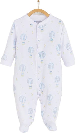 Basic Footie Pajama. White Base With Embroidered Logo On The Left Chest, Our Robin Collection Features A Beautiful And Cute Print Of A Little Blue Cat Flying In A Hot-Air Balloons, Surrounded By Moons And Stars. It Features Embroidery Details On The Collar And Sleeves. A Must-Have Pajama For Your Baby.