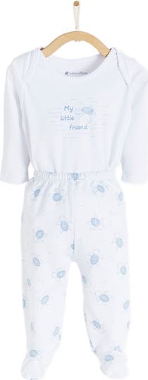 Adorable 2-piece printed set for baby, including a bodysuit and long footless pants. Made from soft cotton for gentle skin contact. Perfect for everyday wear. Softest quality for baby's skin. Bodysuit with snap buttons for easy diaper changes. Pants with cute blue turtle print.