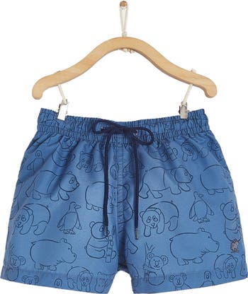 Dive into style with our Beach Collection Printed Swim Short, designed for kids' active lifestyles. Made from quick-drying fabric, this short features an adjustable waistband with internal mesh lining for comfort. With a fun and colorful print, this short is perfect for swimming, surfing, or just playing in the sun. Dark blue background with adorable animal designs.