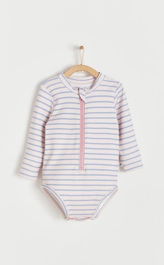 Make a splash with our Beach Collection Long-Sleeve Swimsuit, designed for kids' delicate skin. Crafted from soft, stretchy fabric, this swimsuit features a full-front zipper and snap buttons at the crotch for easy changes. With built-in UPF protection, this suit blocks harmful UV rays, keeping your little one safe and protected. Soft white background with delicate light blue stripes.