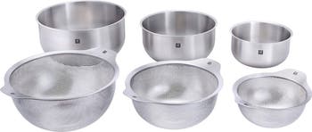 Cast from robust 18/10 stainless steel designed to stand up to use every day, these bowls and strainers work together to streamline prep work and they nest together to keep cupboards neat and tidy after you've cleaned up. With high sides and flat bases, the bowls deliver more stability, less splatter and mess-free pouring.