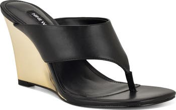 A wide strap and center toe post distinguish a faux-leather flip-flop featuring an angular square toe and sculptural wedge heel for striking dimension and height.