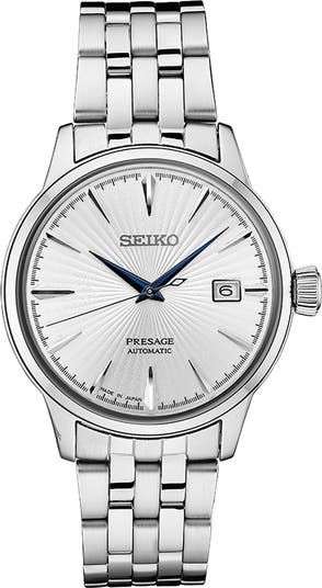 Delicately curved hands and dagger indexes detailing the pressed-pattern dial bring a decidedly vintage air to a Japanese-crafted timepiece powered by a precision automatic movement.