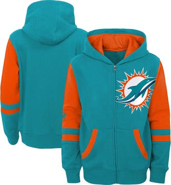 Cooler temperatures won't hamper your little one's Miami Dolphins showing of spirit when they bundle up with this Stadium full-zip hoodie. It features a sizable Miami Dolphins graphic printed on the chest along with a color block pattern that leaves no doubt who has their newfound support. The midweight design also makes this full-zip hoodie an ideal choice when the temperature drops.