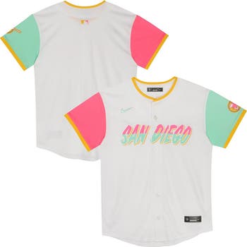 Get your young fan outfitted in the latest San Diego Padres gear with this Nike City Connect Jersey. Inspired by the on-field jersey, this replica features a Vapor Premier chassis made with breathable, high-performance fabric that improves mobility and moisture management. The San Diego Padres' City Connect identity is highlighted with a heat-applied twill team wordmark at the front with faux stitching and a stitchless team patch at the right sleeve.
