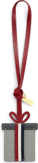 Complete your look with a pebbled leather bag charm featuring a gift wrapped in Thom Browne's signature stripes.