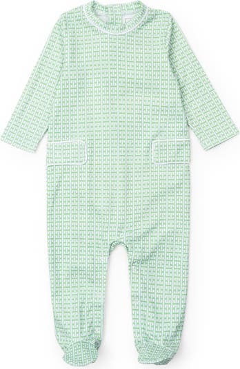 Long sleeved pima cotton footed romper with white piping detail around neck, and side plackets. Snaps in stride and back of neck. Made from 100% Peruvian Cotton.