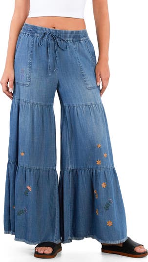 A tiered silhouette adds charming volume and movement to these flowy wide-leg pants sweetened by floral stitching.