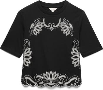 Add a fabulous flourish to your look with the lavish floral embroidery and scalloped hem of this T-shirt cut from soft cotton jersey.