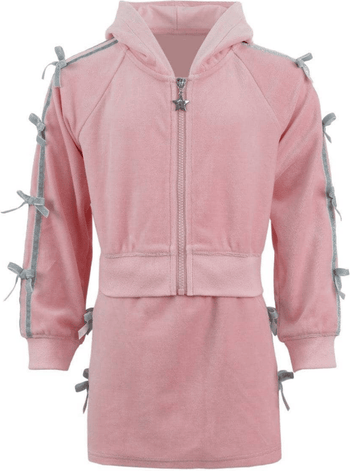 Adorable two-piece velvet set featuring a cropped zip-up hoodie and matching skirt with shorts built in. Accented with delicate velvet bow details along the sleeves and sides for a playful and feminine touch. Soft, luxurious fabric provides comfort and style, making it perfect for special occasions or trendy everyday wear. shorts