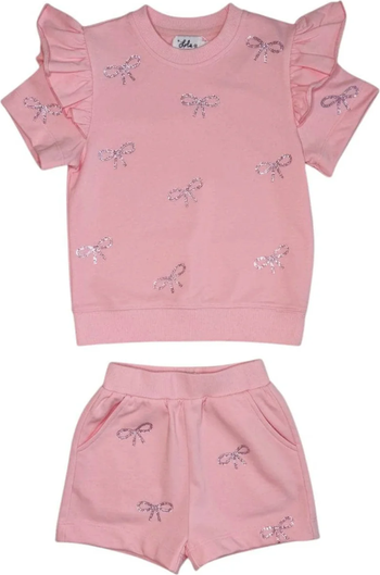The Pretty in Crystal Bows Short Set features a chic top with flutter sleeves and sparkling crystal bow accents. Matching shorts with crystal bow embellishments and an elastic waistband ensure comfort and style. Perfect for summer outings or stylish playdates, combining sparkle and charm effortlessly.