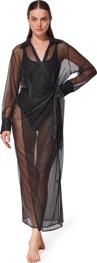 Shimmering mesh and a flattering wrap silhouette define the Pretty Women Mesh Wrap Dress Cover-Up. Adjustable side tie and inside button closures ensure a perfect fit, while long sleeves and a collared neckline add refined detail. Designed to layer over any of our swim collections, it transforms your look from poolside to boardwalk with chic, effortless style.
