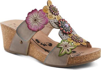 Embellished floral appliqués and hand-painted leather bring enchanting artistry to a stunning slide sandal lofted by a cork-wrapped platform and integrated wedge heel. An adjustable instep strap provides a comfortable and secure fit.