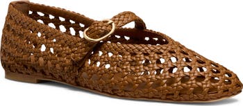 Geometric perforations and a square toe highlight the finely woven leather on a Spanish-made flat featuring an adjustable mary jane strap for a customized fit.