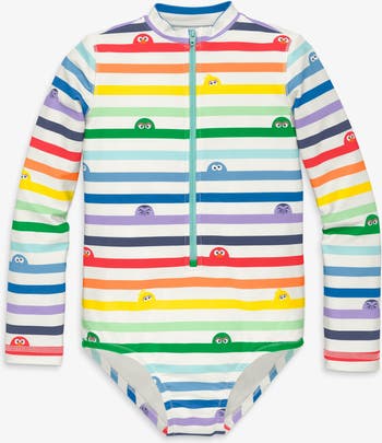S is for slather-free sun protection! Featuring a colorful cast of beloved Sesame Street characters, this quick-drying rash guard is made with UPF 50+ protection for all day fun in the sun. Lightweight, smooth, and stretchy in a comfortable, snug fit with full bottom coverage and a half-zipper for easy dressing.