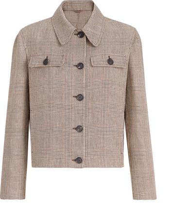 The twisted-yarn construction gives the linen Prince of Wales fabric a substantial, textured hand, while the special finish enhances its softness and comfort when worn.