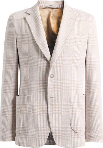 A plush cotton-linen knit patterned in a traditional glen check pairs comfort with classic detailing in a sport coat tailored with rounded shoulders complementing its subtly fitted waist. Pair it with softer fabrics and elevated-casual pieces to create a look that's both smart and relaxed.