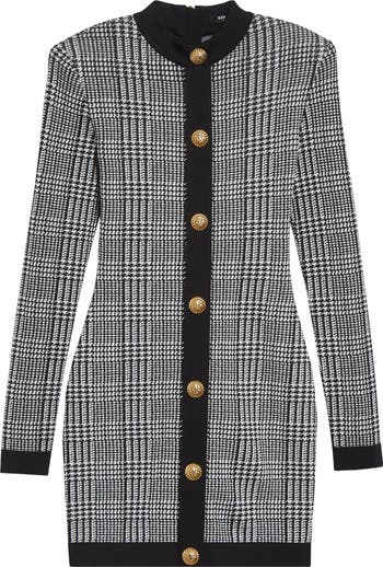 Prince of Wales plaid brings sartorial polish to this quintessentially Balman sweater-dress that commands attention with its strong-shoulder silhouette and signature crested buttons.