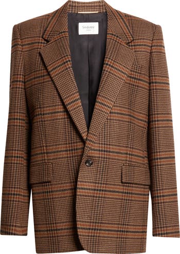 Patterned in a Prince of Wales plaid in earthy hues, this warm wool blazer is expertly tailored in Italy in a longline, one-button cut for a classic look.