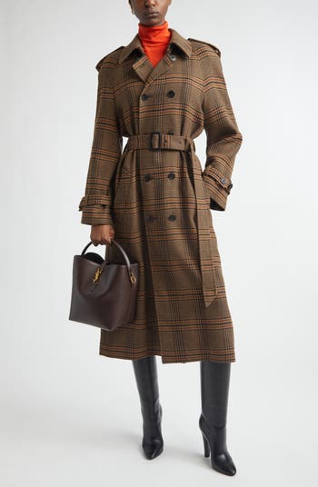 Patterned in a Prince of Wales plaid in earthy hues, this warm wool trench coat is expertly tailored in Italy in a classic double-breasted design.