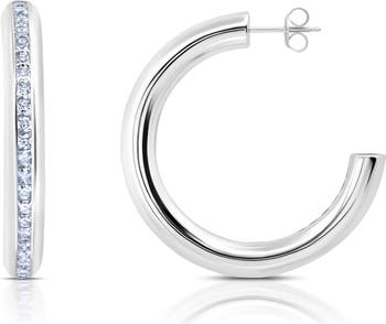 Princess-cut cubic zirconia are perfectly hand set into the channels of these minimalist hoop earrings.