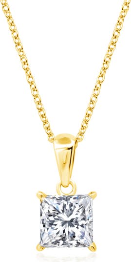 A princess-cut solitaire cubic zirconia is hand set at the center of this sterling silver necklace warmed with 18-karat-gold plating.