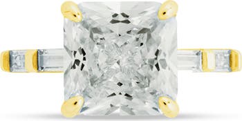 A bold princess-cut center stone is balanced by delicate baguette-cut cubic zirconia along the band, creating a sculpted, sleek ring designed to take your breath away.