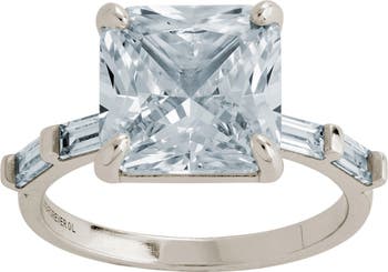 A bold princess-cut center stone is balanced by delicate baguette-cut cubic zirconia along the band, creating a sculpted, sleek ring designed to take your breath away.