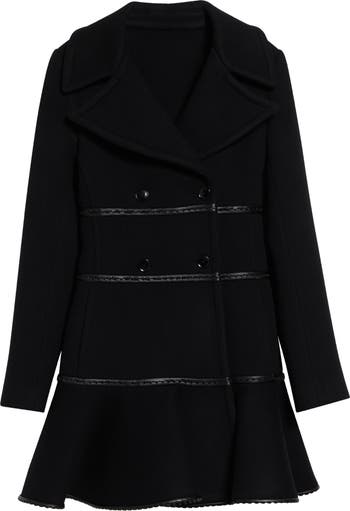 The meet-cute of peacoat and peplum plays out to a happily-ever-after for this dress-length double-breasted coat made from warm virgin wool and ringed in leather strips at the waist, hips and hem.