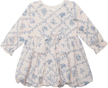 This enchanting long-sleeve princess dress features a delicate blue toile floral and scenic design on a soft cream background. With its gathered, flared skirt and a sweet bow accent at the waist, it?s perfect for twirling moments. The cuffed sleeves and rounded neckline add a sweet touch, making it a graceful choice for special occasions or everyday elegance.