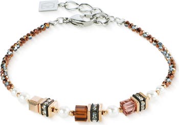 This bracelet is an elegant expression of grounded beauty. The combination of deep brown, warm rose gold and sparkling accents of crystals and tiger's eye makes it a versatile favourite. Fine rhinestone rondels and high-quality materials come together to create a stylish accessory that goes perfectly with the matching necklace and earrings.