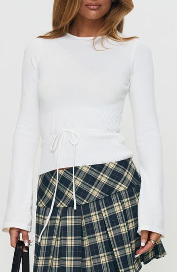 A ribbed-and-tied hem adds texture and shape to this close-fitting knit top framed by flared cuffs.