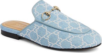 Gleaming horsebit hardware evokes Gucci's equestrian heritage on this loafer-style mule clad in iconic GG denim.