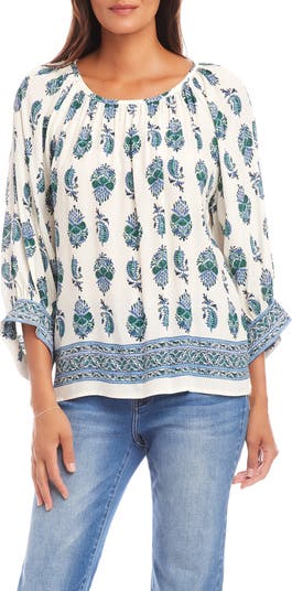 Cut from lightweight crepe for the perfect drape, this billow-sleeve top is designed with a swirling paisley print and a contrasting border.