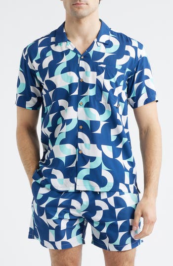 A bold print and coconut-shell buttons bring breezy vibes to this lightweight camp shirt made from premium fibers.