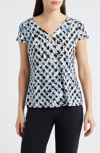 Classic cap sleeves and a pleated neckline frame this lively top elevated with a subtle keyhole for an extra touch.