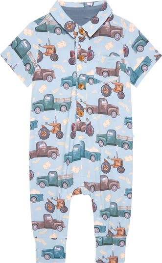 A fun farm-vehicle print revs up baby's day in this stretchy jersey romper made with a chest pocket to hold extra spark plugs.