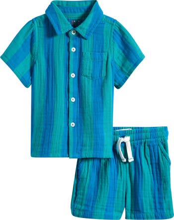Colorblock stripes add to the cool factor of this woven cotton button-up shirt and matching shorts set that will give baby a complete, polished look.