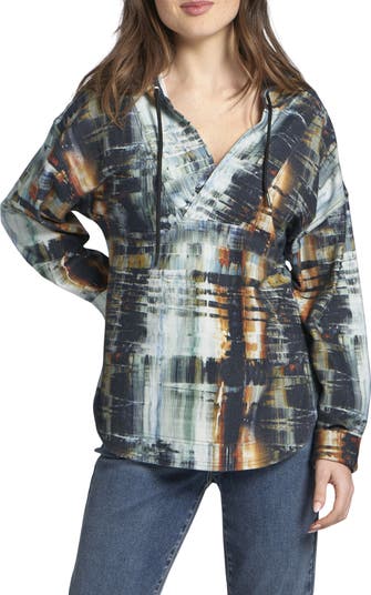 Side slits ease the silhouette of a casual hoodie covered in stripes and ready for beach walks and cozy afternoon hangs.