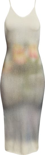 Floral imagery is diffused across the body as if suspended beneath the surface on this body-hugging sweater-dress knit in a fine rib stitch and tethered with narrow straps. The print recalls still-life compositions reworked through a blurred, engineered placement.
