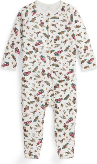 The label's beloved bear mascot stars in the festive scene that unfolds on this all-cotton footie secured with a quick zip closure for effortless diaper changes.