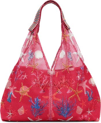 This breezy net shopper is printed with sea motifs and embellished with beaded starfish, while a printed liner keeps items secure for your beach-day excursions.