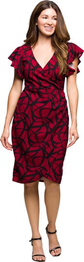 Bring bold style and effortless sophistication to your wardrobe with this Burgundy Abstract Print Flutter Sleeve Faux Wrap Dress. Designed with a flattering faux wrap silhouette, this dress features flutter sleeves that add movement and charm. The abstract black swirl print against a rich burgundy background makes a striking statement, perfect for both day and evening occasions. Cut at midi length with a figure enhancing fit, this dress offers comfort and confidence for any setting. Made from a soft and stretch friendly polyester blend, it’s easy to wear and care for, making it a must have piece for the season.