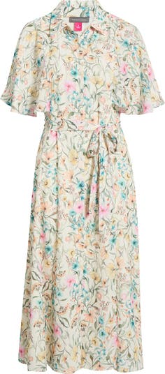 Fluttering sleeves and a flared skirt add graceful movement to this lightweight maxi covered in enchanting blooms.