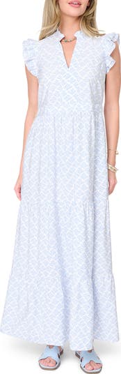 An allover print enlivens this light and lovely maxi framed by fluttering sleeves and finished with a frilled hem.