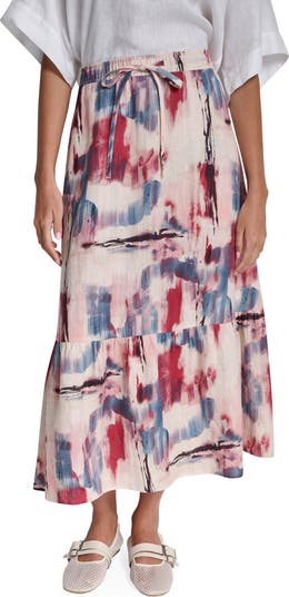 An artistic print brings color and playful energy to a breezy linen skirt with a tiered hem for flowy movement.